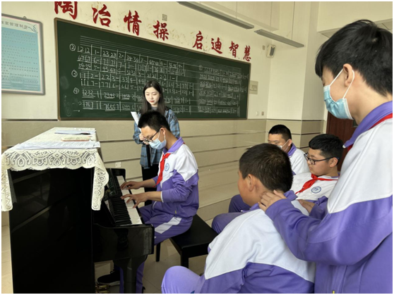 我所在实习学校位于天津市双口镇,是一所较为偏远的农村学校。这里的孩子大部分没有音乐基础,又经历了长时间的网课学习,对音乐基本是零基础。除了我学校里只有一位音乐老师,我们共同承担起七年级和八年级的音乐教学工作。为了提高学生的艺术素养,增强他们对音乐的感知能力以及对音乐的兴趣,我们设置了三个关于音乐的课后服务项目,分别围绕京韵大鼓、小合唱和钢琴开展学生美育素养教育。通过指导老师不断打磨和帮助,我努力做到以学生为中心,立足学情提高学生的音乐素质。
