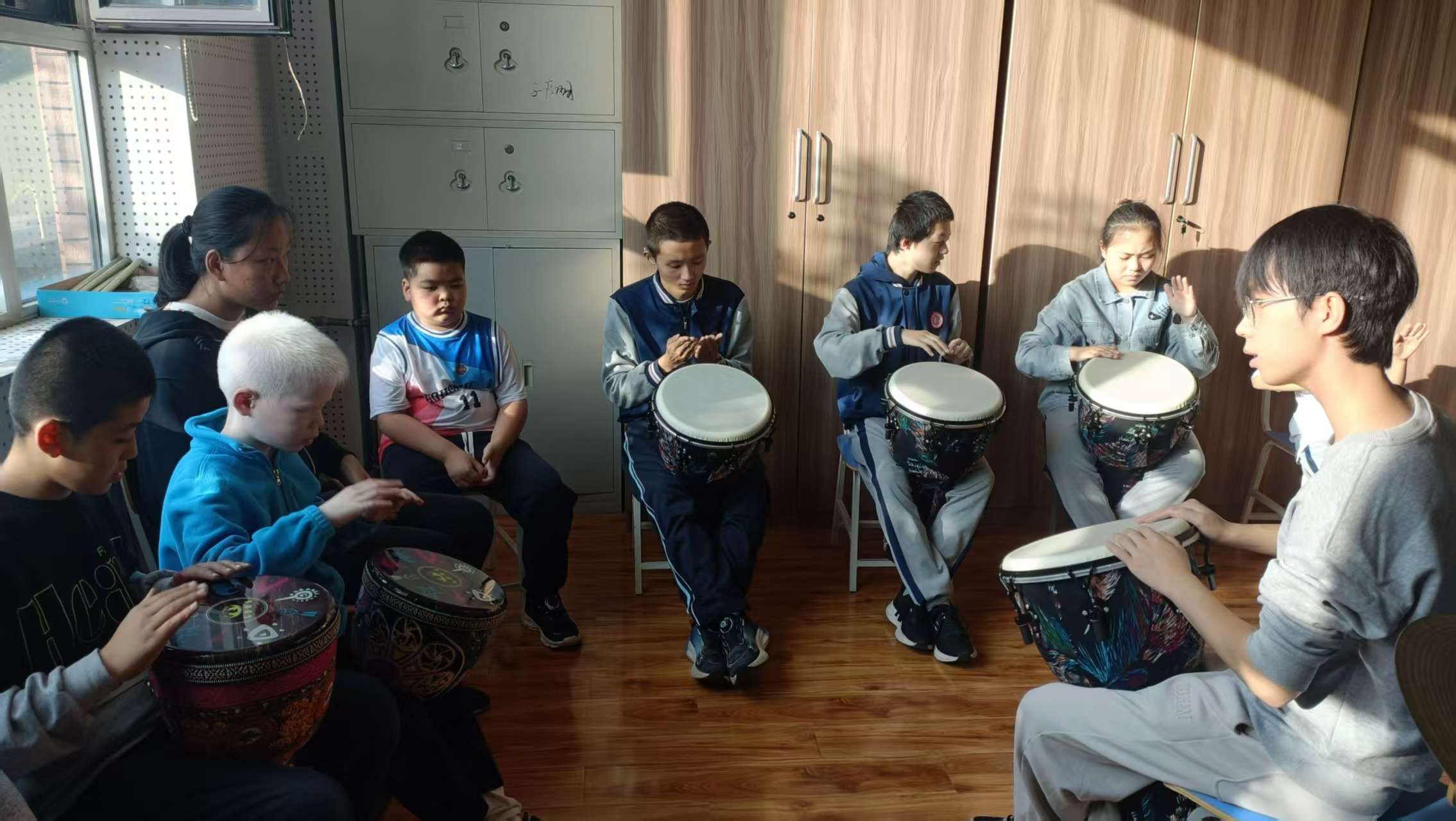 本学期,我在老师们的带领下多次走进石家庄特教学校。当孩子们沉浸在非洲鼓节奏中时,我总是满心温热。他们或许不善言辞,但鼓点响起时,他们身上洋溢着对音乐的本真热爱。我从基础节拍教起,让孩子们贴在鼓面上感受震动,见证他们从生疏拍打,到跟上节拍、尝试创编。音乐是跨越障碍的桥梁,非洲鼓带给他们快乐,更帮助们建立自信、学会配合。这段经历也洗礼了我的心灵,让我学会包容,理解坚守。未来我愿继续带鼓而来,让鼓点传递爱与希望。