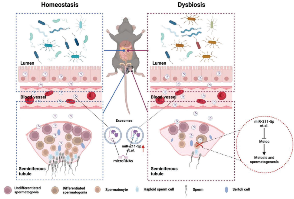 研究成果“Gut-Derived Exosomes Mediate the Microbiota Dysbiosis-Induced Spermatogenesis Impairment by Targeting Meioc in Mice”发表在Top期刊《Advanced Science》上,课题组博士生陈通同学为第一作者,周虚教授和李纯锦教授为通讯作者。