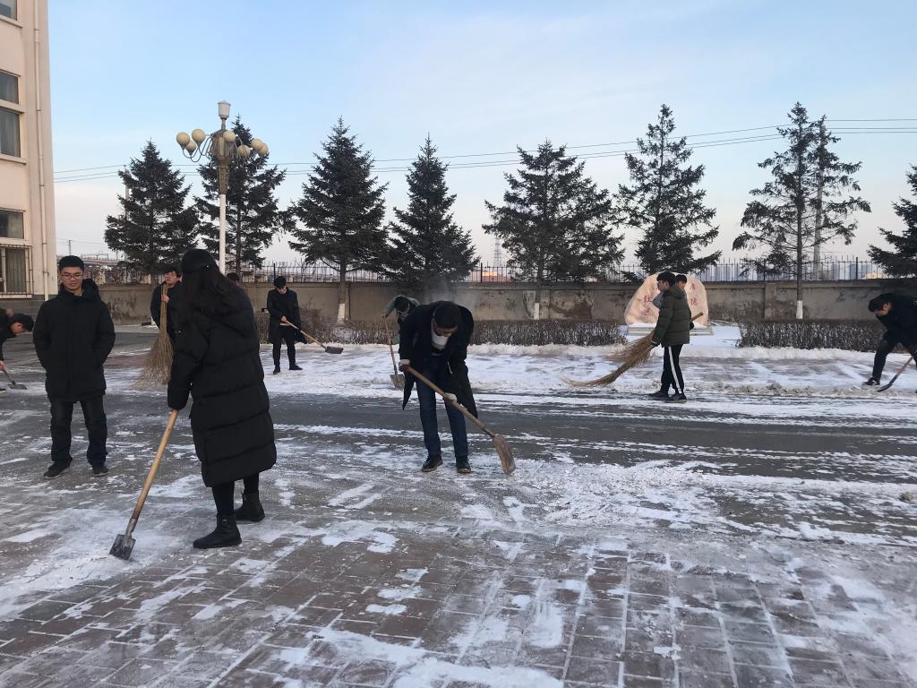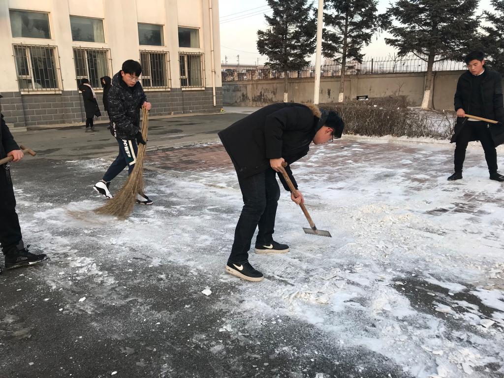 扫雪过程中,很多地方的雪已经被踩实,清扫难度比较大,但是同志们不畏严寒、积极主动、相互配合,挥舞着铁锹,一点点地将积雪和冰层铲起集中堆放,并且扔到了花池当中。尽管同学们的手和脸被冻的通红,然而这一切丝毫没有影响大家的工作效率;虽然寒风凛冽,但是这也掩盖不住同志们的年轻与活力,大家热情高涨,充分发扬了吃苦耐劳、顽强拼搏的精神。同志们干劲十足的身影感染着每一个路过的人,经过了近一个小时的奋战,路面基本恢复了畅通洁净,成果显著。