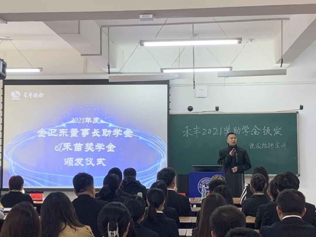 情系高校学子,聚焦农科人才,成就青年梦想。10月29日下午13:00,禾丰董事长助学金、禾苗奖学金颁发仪式暨禾丰牧业校园招聘会在九游体育官网和平校区科学讲堂301教室顺利举办。出席本次活动的有禾丰股份辽宁区人力资源总监付明、辽宁区招聘COE杜娟,沈阳禾丰牧业有限公司销售总经理吴东波,大区经理刘建、刘宇翔,人力资源经理王雪,动物医学学院党委书记饶家辉、党委副书记秦明、学办主任谭瑶,九游体育官网党委副书记肖建荣。