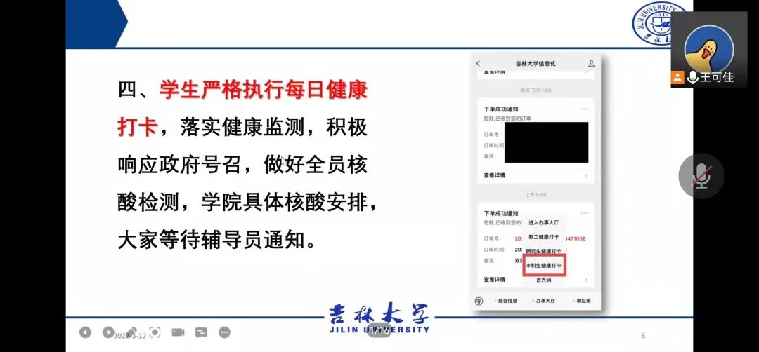 同学们暖心回应:“老师们请放心,我们将严格遵守学校规定,合理规划本学期学习生活,认真完成线上课程,做自己生命健康的第一责任人,守护我们的吉大校园,更守护我们的家。”与会老师叮嘱同学们坚决要做到三个“要”:一是要相信,相信国家、相信学校;二是要重视,重视疫情、重视防控;三是要适应,适应教学方式、适应封校生活。