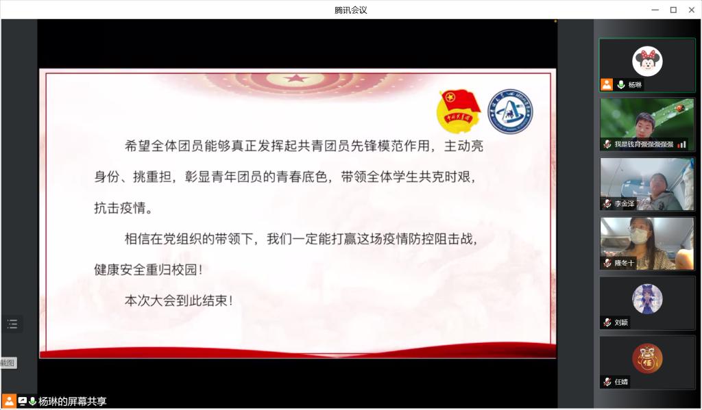 最后,团支部书记杨琳进行会议总结:“希望全体团员能够真正发挥起共青团员先锋模范作用,主动亮身份、挑重担,彰显青年团员的青春底色,带领全体学生共克时艰,抗击疫情,相信在党组织的带领下,我们一定能打赢这场疫情防控阻击战,健康安全重归校园!”。