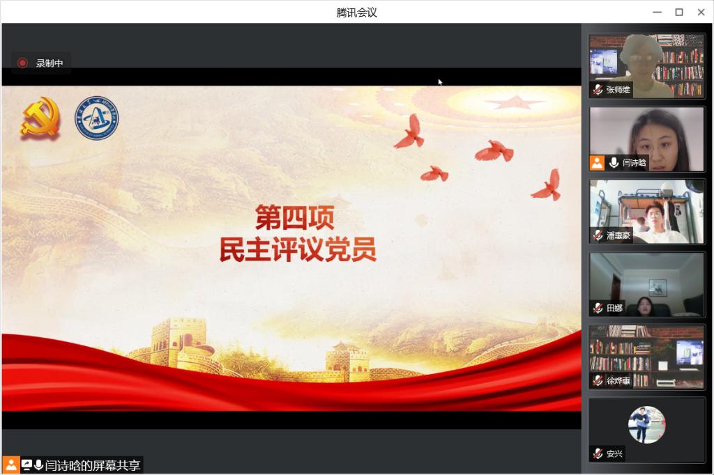 会议第三项议程,支部全体党员根据“四个对照”相关要求,从学习、生活、工作等多方面反思自身不足,进行自评互评。一部分同学认为自己专业知识学习不系统,学习方式被动,理论受限于实际;一部分同学谈到,要坚持对马克思主义信仰,坚持对中国共产党的追随,反思自身服务意识不够,很少展开自我批评,对自身缺点认识不足。在互评环节中,老师同学们也纷纷提出了客观中肯的批评意见,党员们一致表示虚心接受批评指导,并认真改正自身不足。紧接着,全体党员同志按照学校党委组织部的民主评议党员相关规章制度,客观、公正地对支部正式党员进行“优秀”、“合格”、“基本合格”和“不合格”四个等级的评价,评选出王文韬、苏梦婷等六位优秀共产党员。