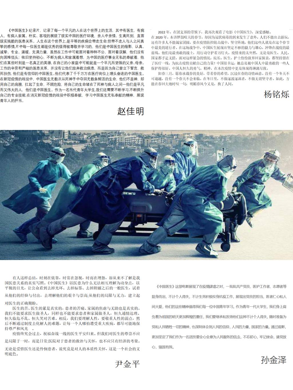 赵佳明同学表示,“《中国医生》纪录片,记录了每一个平凡的人在这个世界上的生活,其中有医生,有病人,有病人家属。朴实、客观的展现了现实中国的医疗环境,亲人中亲情、生离死别,直面现实残酷的医患关系。人生在这个世界上,是平等的疾病会带走生命,但带不走人与人之间真挚的感情,片中每一位医生都是优秀的值得被尊敬并学习的,他们是中国医生的缩影,认真、诚挚、专业、温暖、充满力量,虽然在工作中可能面对着种种不公,面对着误解,他们没有向困难低头;依旧坚持初心,不断为病人和家属着想,为中国的医疗事业无私的奉献着,他们在某些时刻是一名真正的英雄,在自己的小家庭中可能就是一个平凡而坚强的父亲、母亲。工作的辛劳和严峻的医患关系,并没有让他们放弃救治病患,而是因为自己曾立下誓言,救死扶伤,他们是有信仰的中国医生。他们代表了千千万万在医疗岗位上埋头奋进的中国医生。在新冠疫情的战役中,中国医生无数次从死神手中夺回无数条鲜活的生命,他们不是神,却用自己的肩膀,扛起了生命,不顾危险,将自己的生命堵在了死神与病人之间一他们是平凡而又伟大的人,他们是中国医生。作为一名当代青年大学生,我们还需要不断学习,不断提升自己的专业技能,在消灭新冠疫情的战役中积极奉献,学习中国医生无私奉献的精神,展现青年人的担当。”