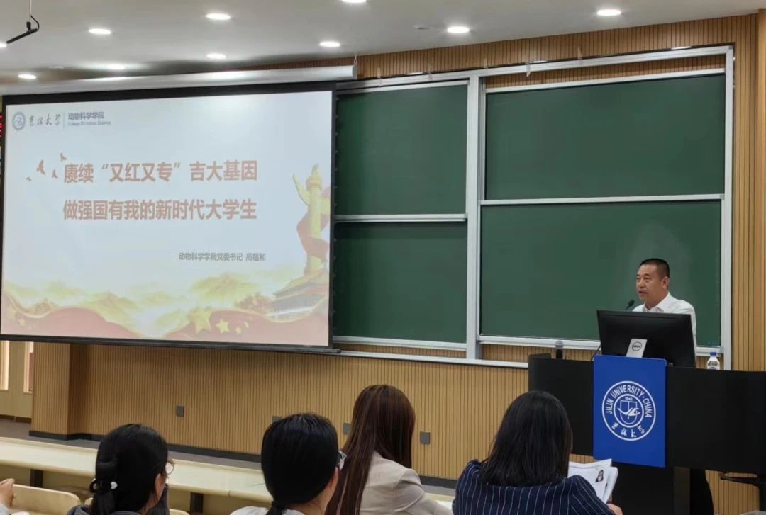 高福和以“赓续‘又红又专’吉大基因,做强国有我的新时代大学生”为题,围绕“又红又专”的精神内涵、如何弘扬“又红又专”精神等两个方面讲授第一课。他首先从红色基因的革命精神、至诚报国的黄大年精神、艰苦创业的北上精神等三个角度阐释了“又红又专”的精神内涵,又介绍了动物科学专业的基本情况和优秀校友,鼓励同学们要树立知农爱农、学农为农、强农兴农的意识与使命。
