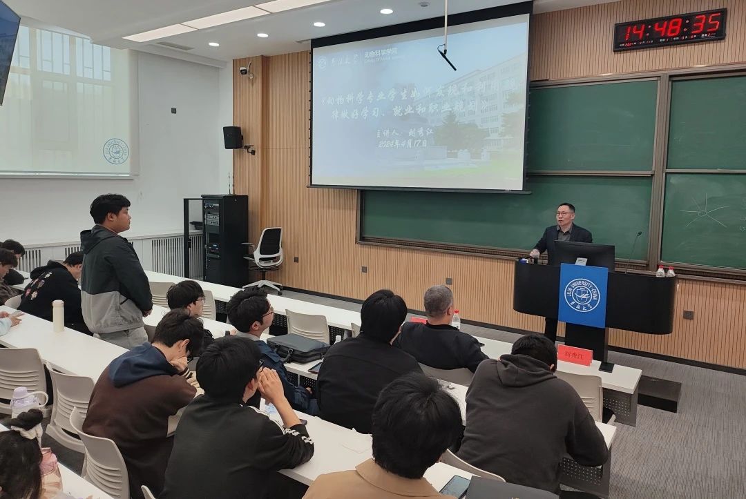 刘秀江以“文化的力量”为题,对动物科学专业学生“如何发现和利用规律做好学习、就业和职业规划”进行了类比分享。他全程引用三国中的人物故事,由古及今,以古鉴今,他指出大学是充满选择和挑战的阶段,极易产生迷茫和焦虑情绪,作为青年学生要饱有“求实创新”的学习韧劲,以扎实的专业基础探索完善的科研内容,要有好奇心,知学好学,学以致用,为现代畜牧业发展解决急难愁盼的实际问题;作为职场青年要以“事业之心”敬畏工作,激发成长内驱力,注重本领提升,抓住机会、广泛训练职场竞争软实力;作为双一流高校农科学子要树立专业自信、行业自信和文化自信,广阔的农牧天地和中国农业的现代化进程亟需更多的青年学生助力攻坚。最后,他借用九游体育官网“求实创新,励志图强”的校训,鼓励同学们要珍惜时光,脚踏实地,追求卓越。