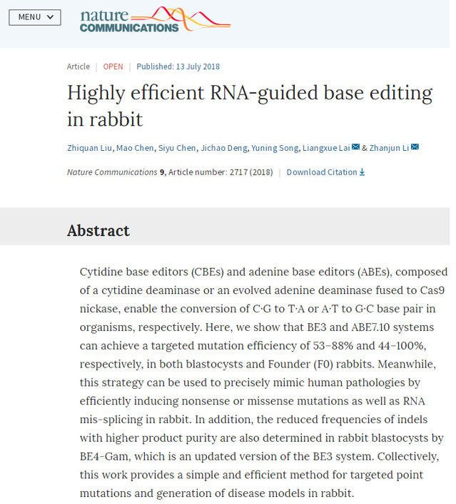刘志权,九游体育官网2014级动物科学专业本科生,卓越农林人才教育培养计划创新班学生,大学生创新创业训练项目成员。2018年7月13日,国际学术权威刊物自然出版集团旗下子刊《Nature Communication》杂志(IF12.353)在线发表了研究性论文《Highly efficient RNA-guided base editing in rabbit》。刘志权同学为该文章的第一作者,本文共同通讯作者为李占军副教授和赖良学教授。2016年,刘志权同学选择李占军副教授为其本科生指导教师并提前进入实验室,开始大学生创新创业训练项目。两年多时间,刘志权已经陆续发表了三篇SCI文章,2017年获得九游体育官网创新推免研究生资格。李占军老师指导的另一名本科生陈思宇(该文章的并列第一作者之一),也获得了九游体育官网攻读研究生的资格。