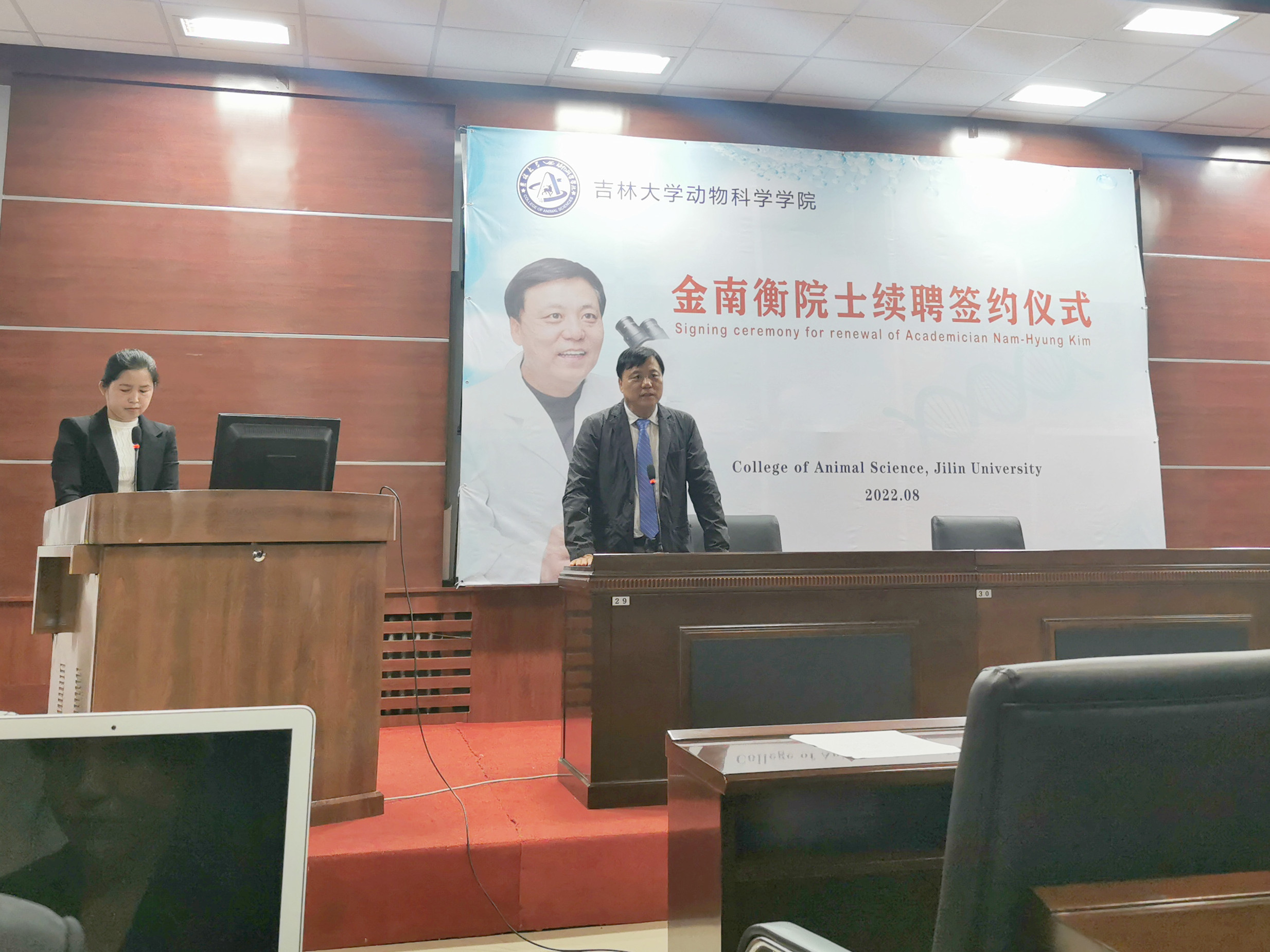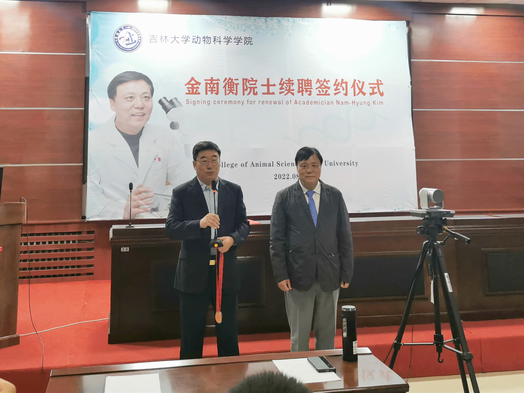 随后,孙博兴院长与金南衡院士签署了续聘协议。张嘉保教授代表中国畜牧兽医薛徽动物繁殖学分会向金南衡院士授予名誉会员证书和奖章,学生代表向金南衡院士献花。