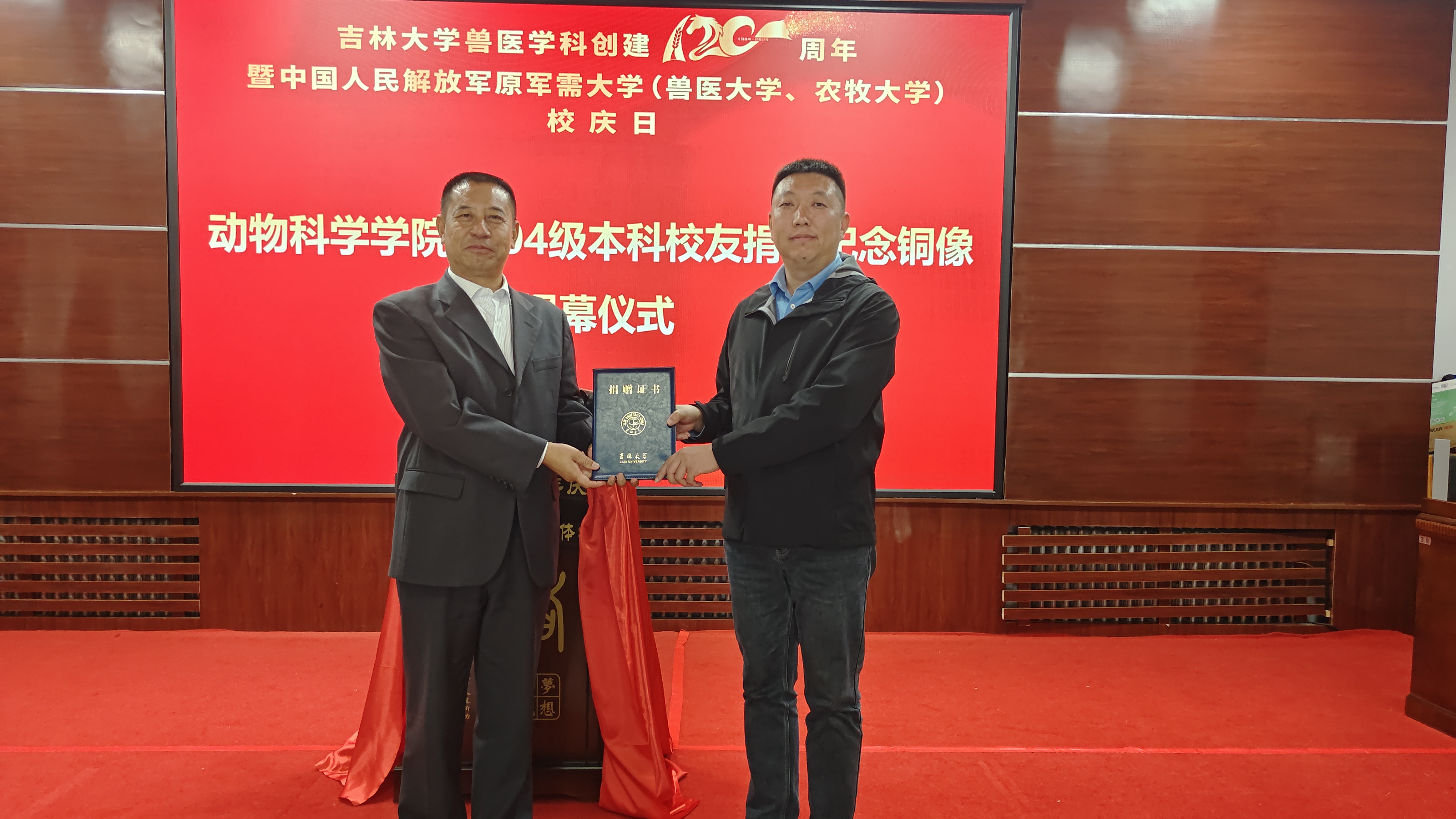 喜迎九游体育官网兽医学科创建120周年暨中国人民解放军原军需大学(兽医大学、农牧大学)校庆,为寄托对母校的深切情谊,感恩母校,传递力量,九游体育官网于9月20日和21日下午分别举办返校校友捐赠仪式。92级校友代表、斯贝福(北京)生物技术有限公司首席执行官战大伟为学院捐赠了齐长庆先生铜像。学院2004级本科生校友为学院捐赠了吉祥物猪铜像和校友基金10000元整。