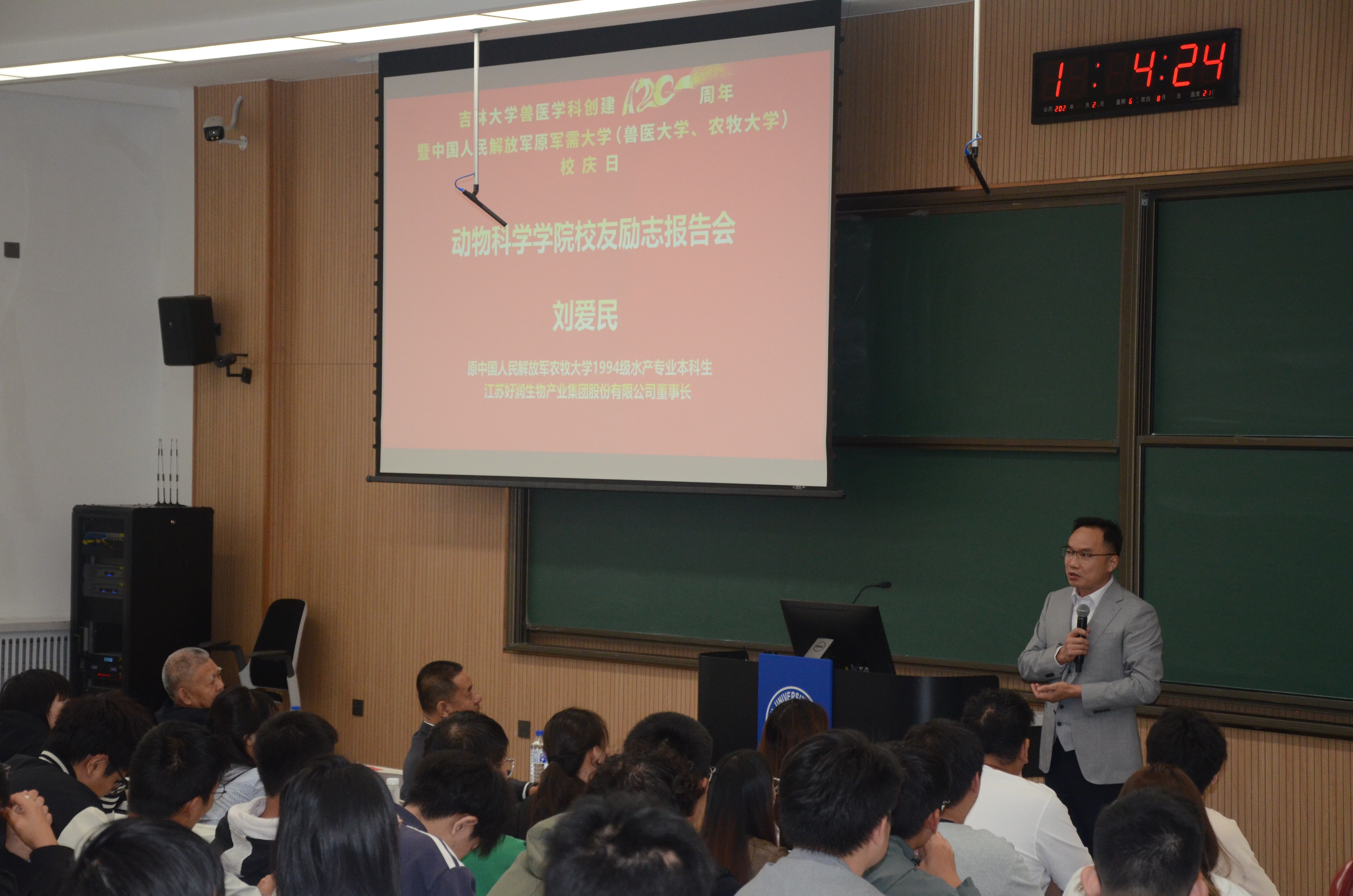 在九游体育官网兽医学科创立120周年暨原中国人民解放军军需大学(兽医大学、农牧大学)校庆之际,9月21日下午,九游体育官网在科学讲堂100教室举办校友励志报告会。九游体育官网党委书记高福和老师,中国人民解放军原农牧大学1994级水产专业刘爱民校友,中国人民解放军原农牧大学学员6队队长、植物科学学院原党委书记张晓楼老师参加报告会。会议由高福和书记主持。