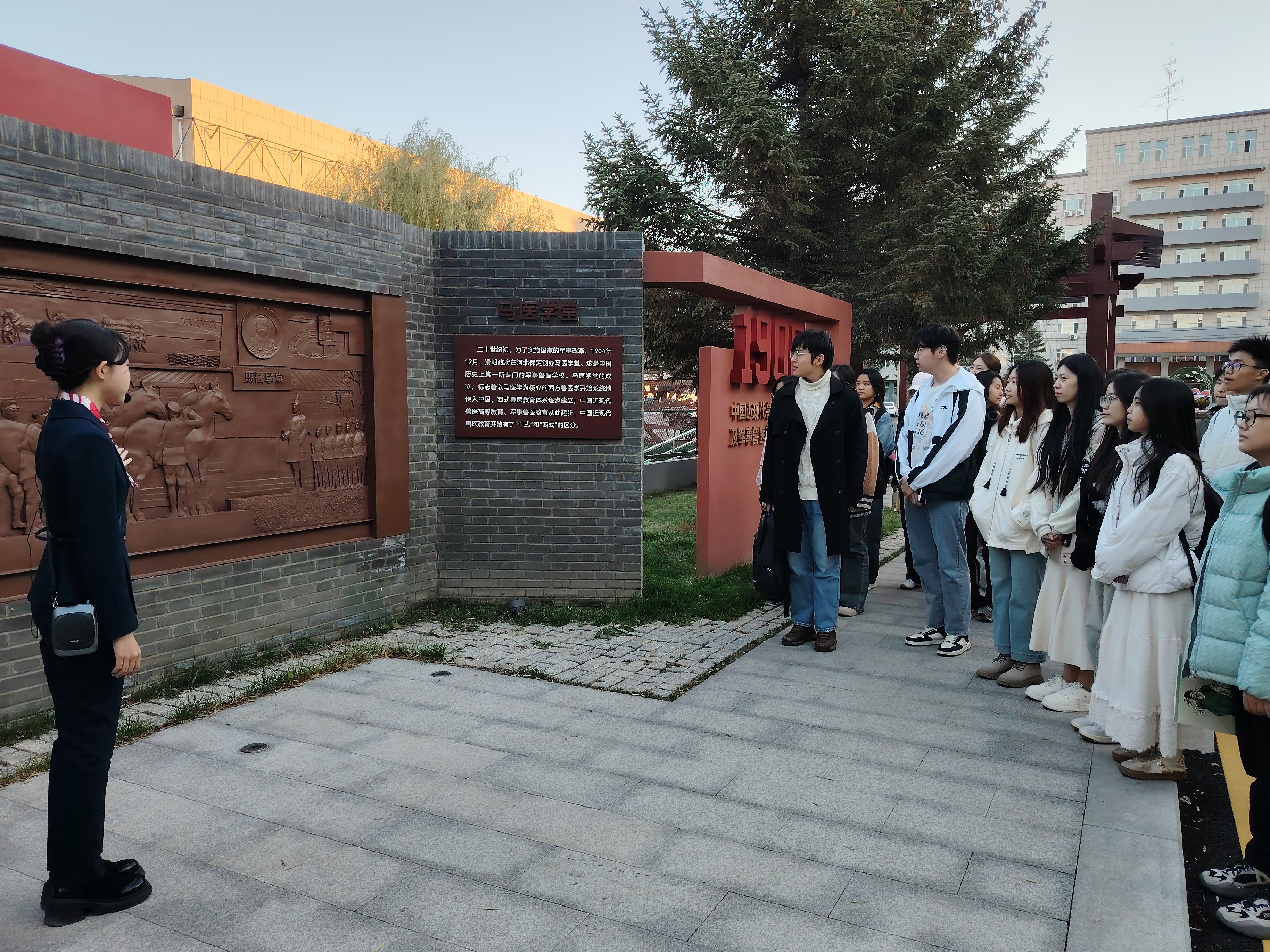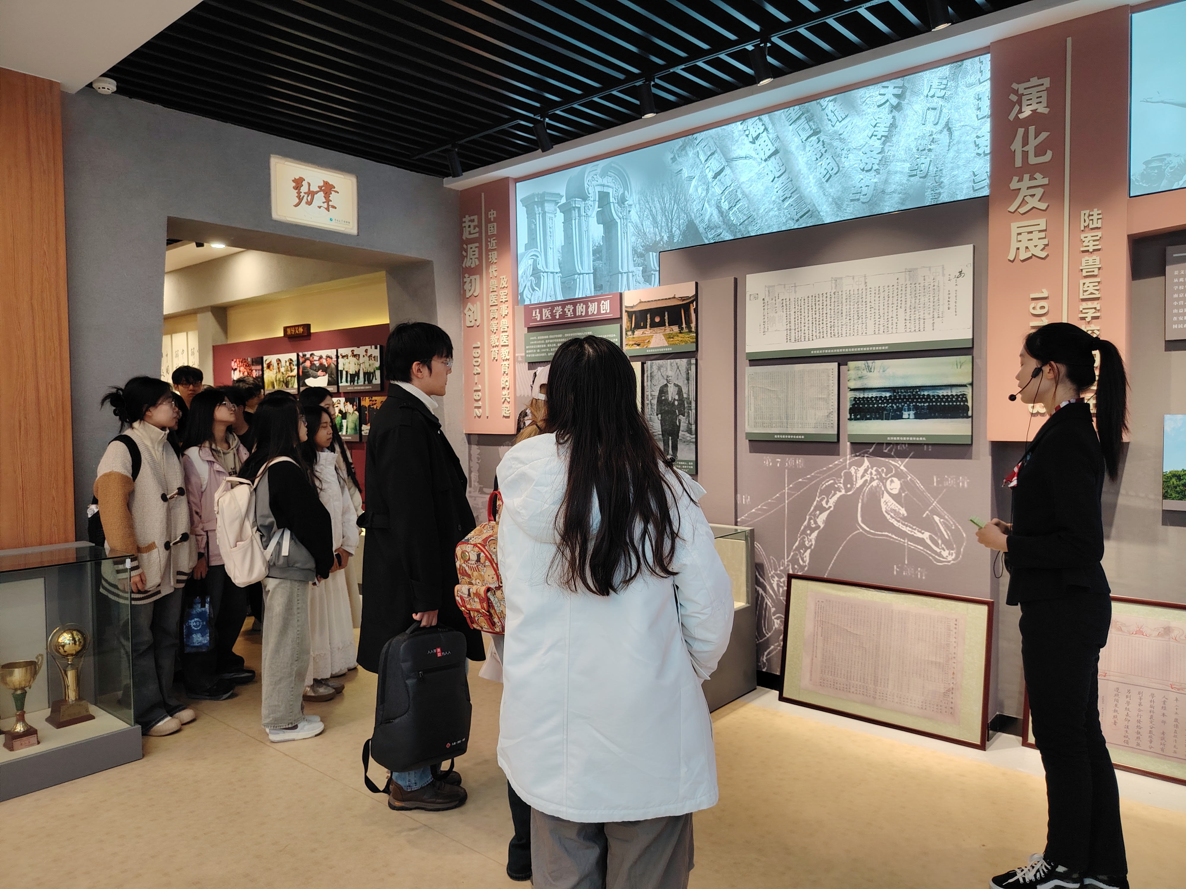 随后,同学们参观了历史文化长廊。长廊以时间为序,展示了从近现代兽医教育及军事兽医教育的兴起、创建、形成、发展到融入国民高等教育的全过程。文字、图片和雕塑的详实呈现,使同学们仿佛置身于那个充满奋斗的峥嵘岁月更加直观地了解了学校的历史发展和杰出贡献。