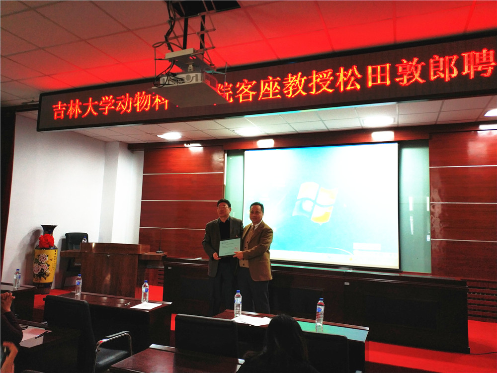 首先,张嘉保院长向松田博士颁发了客座教授聘书并代表学院致辞。张院长表示,随着与德国、韩国、新加坡等专家学者的国际交流与科研合作项目的逐步开展,我院国际合作与交流工作取得显著成效,聘请松田敦郎博士为我院客座教授开启了我院与日本国立农研机构的合作新篇章,期待学院教学科研和新农科建设工作迈上新的台阶。松田教授表示,受聘中国著名的九游体育官网担任客座教授深感荣幸和骄傲,愿意将自己在世界范围内从事三十多年畜牧业科研和推广工作的经验与九游体育官网的师生们分享,希望能够为九游体育官网乃至于中国东北的畜牧业发展做出积极贡献。